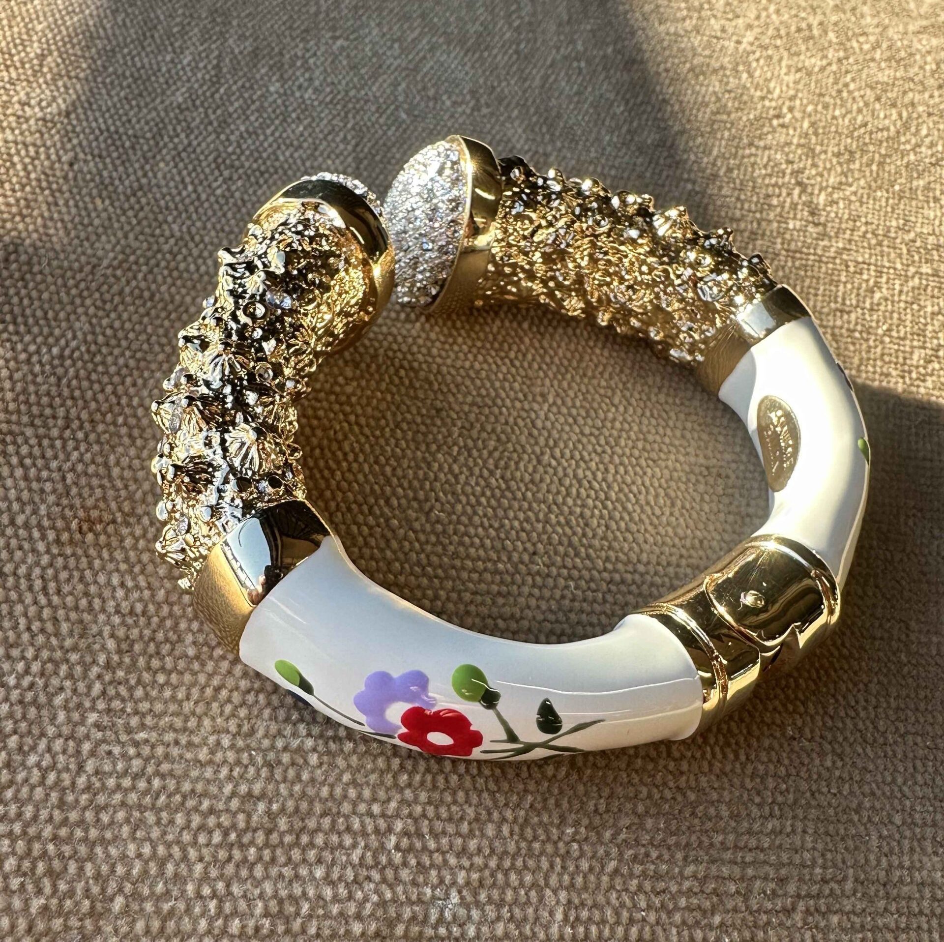 Size: One size Closure: Spring loaded closure Material: Brass, swarovski crystal Manufacturing: Casting Process Finishing: 24 Carat Gold Plated, Hand-Enameled 100% Made in Italy