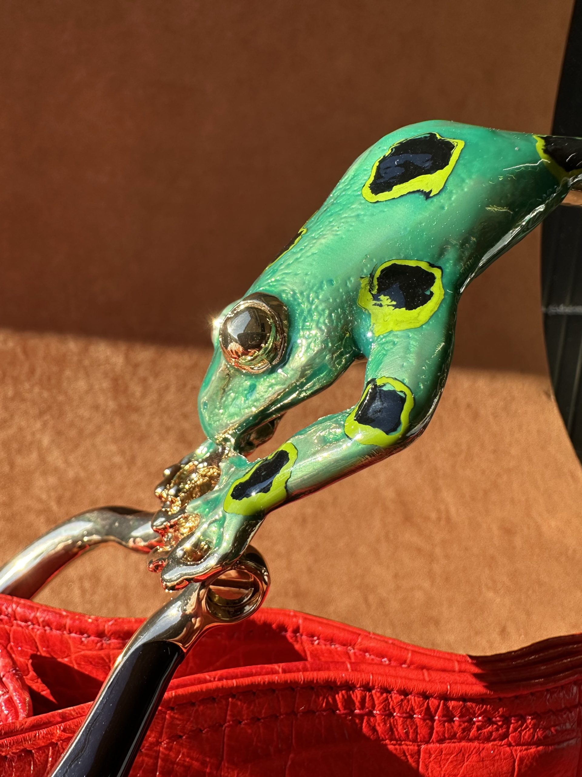 Materiale manico: ottone Sacca: stampa cocco su cervo Materiale: ottone Lavorazione: microfusione a cera persa Finiture: placcato oro 24kt smaltato a mano 100% Made in Italy