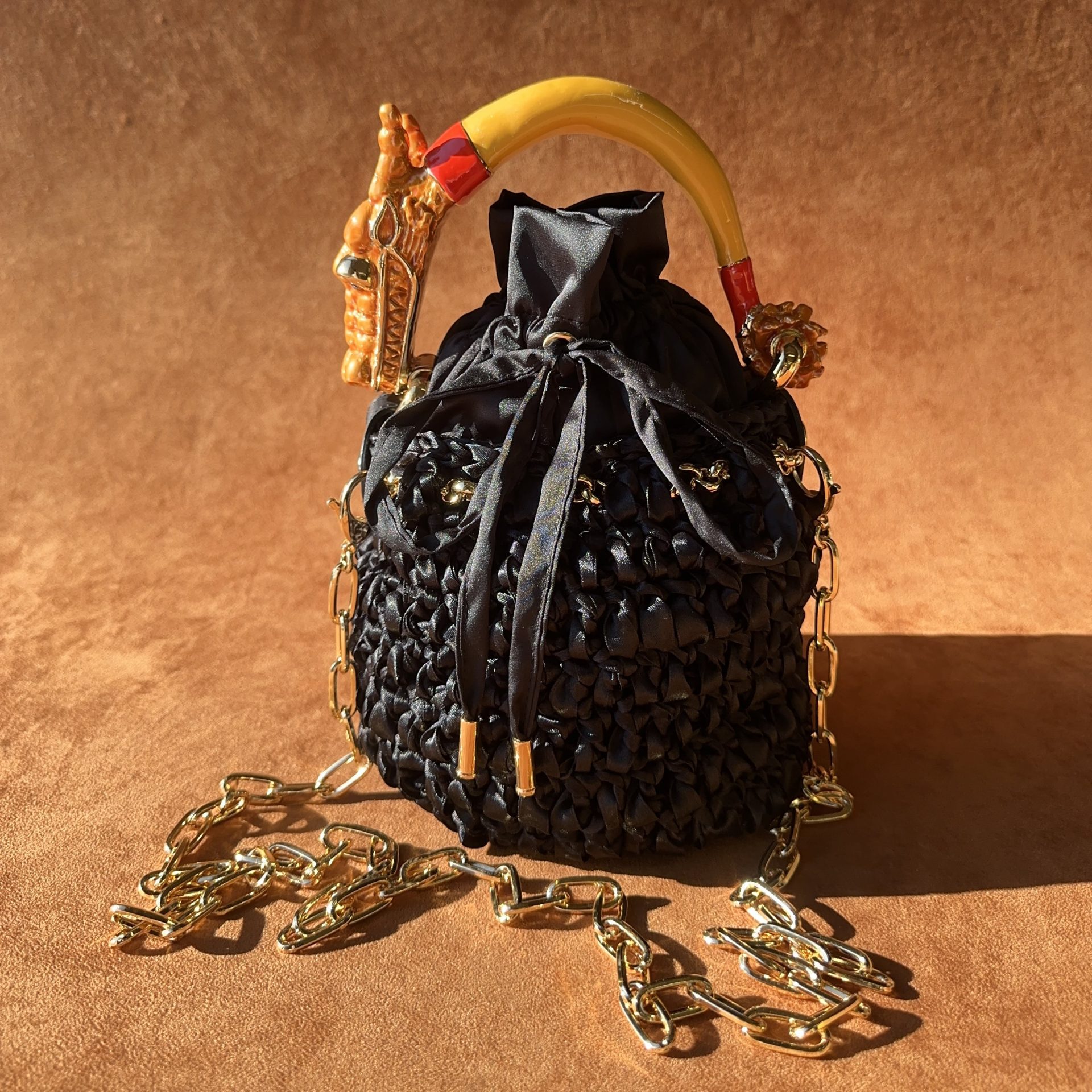 Materiale manico: ottone Sacca: raso, colore nero Materiale: ottone Lavorazione: microfusione a cera persa Finiture: placcato oro 24kt smaltato a mano 100% Made in Italy